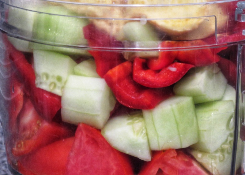 Of course there are traditional methods for preparing the vegetables. Long before the advent of the food processor, people enjoyed Gazpacho. we have access to the food processor, so I toss all my ingredients in the food processor, and let it do the hard work. You want to process the gazpacho until there are no recognizable chunks of any veggies left, but there is still a thick, creamy consistency. You do not want to get too watery.